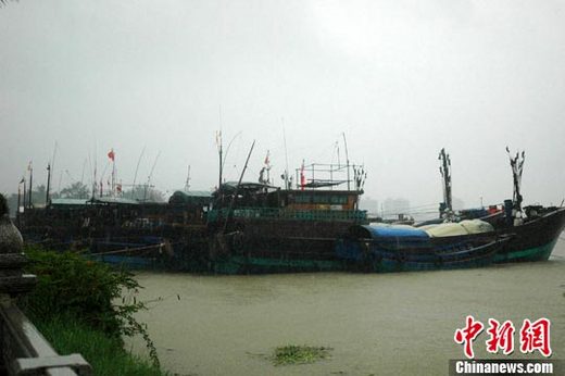 资料图:图为强降雨来袭前,在海口海甸溪内回港避险的渔船。王辛莉 摄