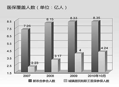 “看病难、看病贵”,是纠结在百姓心头的突出问题。作为医改三年重点实施方案的第二年,2010年承前启后。沿着强基层这一方向,今年医疗体制改革继续攻坚克难。社会保障是民生之基,今年10月,历经多次讨论修改的《社会保险法》正式发布,首次明确“基本养老保险全国统筹”、“养老及医疗保险实现异地漫游”等目标,给百姓吃了一颗定心丸。截至9月底,我国城镇职工养老保险、城镇医疗保险、失业保险、工伤保险、生育保险分别达到25025万人、42072万人、13147万人、15871万人、11973万人,均超额完成 “十一五”规划确定的指标任务。