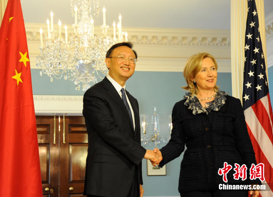 当地时间1月5日,美国国务卿希拉里在美国国务院会晤了中国外交部部长杨洁篪,两国外长此次会面主要是为中国国家主席胡锦涛即将对美国展开国事访问进行“预热”。中新社记者 吴庆才 摄