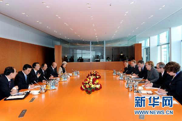 默克尔积极评价两国关系发展,高度赞赏中国的发展成就。她表示,两国关系十分紧密,各领域合作成果丰硕。政治上,双方高层往来频繁,两国领导人就双边关系和国际事务保持信任和密切合作,各种对话机制富有成效。经贸上,两国企业合作与投资扩大,热情很高。文化上,“德中同行”活动顺利落幕。此访将为保持德中关系的连续性作出贡献。德方愿通过中德政府磋商同中方在政治、经济、外交、科技、环保、社会等各领域进行对话,愿在推动欧盟承认中国完全市场经济地位上发挥积极作用。