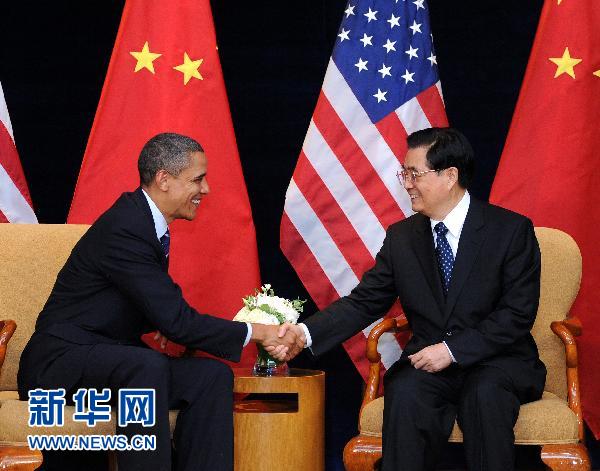 资料图片:2010年11月11日,中国国家主席胡锦涛在韩国首都首尔同美国总统奥巴马举行会晤。新华社记者刘建生摄