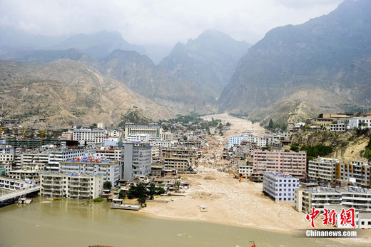 资料图:2010年8月7日夜至8日凌晨,甘肃甘南藏族自治州舟曲县突发特大泥石流,造成重大人员伤亡。图为8月10日,从白龙江南岸的高处拍摄的甘肃舟曲灾区全景。中新社发 廖攀 摄