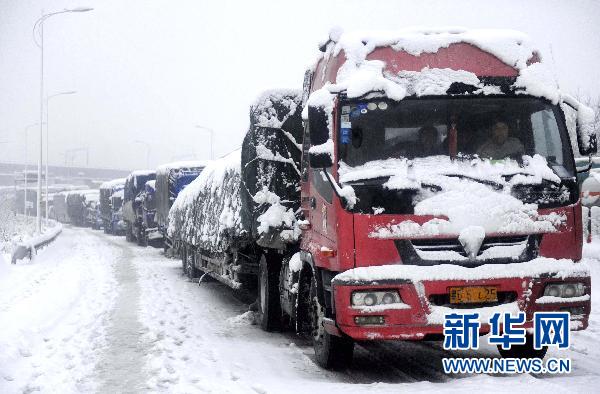 1月20日晨,车辆滞留在昌九高速路上。 1月19日下午开始,暴雪突袭江西九江,积雪厚度超过12厘米,连接鄂赣皖三省的交通大动脉——九江长江大桥(公路桥)桥面出现结冰状况,导致昌九高速从19日22时起开始堵车。截至20日清晨,暴雪仍在继续,从南昌到九江方向的车辆已滞留18公里。新华社记者周科摄