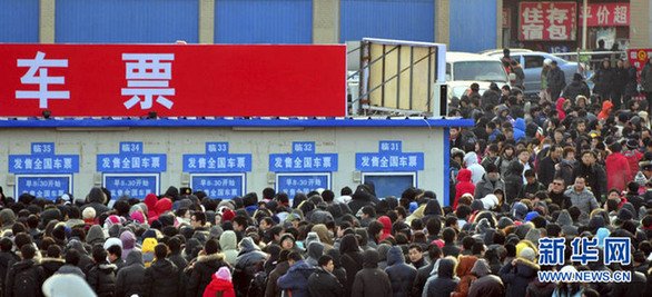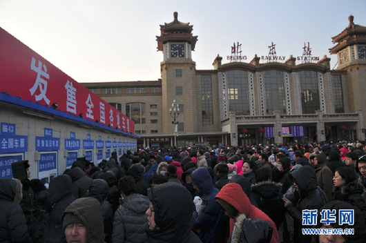 1月22日,人们在铁路北京站前排队买票。昨日上午,车站开始发售腊月二十八的火车票。新华社发(樊甲山 摄)