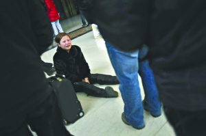 昨日,北京西站,一名女子因为误了火车,还和同行的丈夫走散,无助地坐在地上哭。本报记者 李强 摄