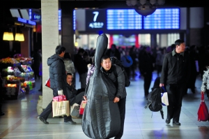 昨日,一名男子扛着比他的头高不少的大提琴进入北京西站。本报记者 李强 摄