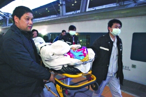 昨日,北京西站工作人员,拆下窗户玻璃,将患者抬到担架上。本报记者 韩萌 摄
