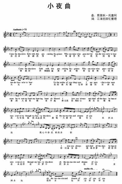 去年夏天的一天,我接到江泽民同志的电话,他问我有没有托塞利《小夜曲》的英文歌词,当时我手头没有,答应帮助找一下。我通过国内外各种渠道进行了认真的查找,找到两个版本的英文歌词,但都不是当年在国内流行的那个版本。江泽民同志也亲自请几位老音乐家帮助寻找,同样没有结果。