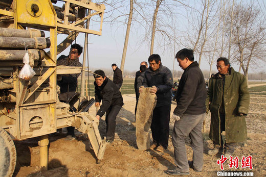 面对严重旱情,山东各地积极实施河道清淤,加强水库蓄水、钻打储水机井等农村水利基础设施建设,为保春灌奠定基础。图为山东省成武县抗旱打井服务队正在地头打井,为实现“以河补源、以井保丰”奠定基础。杨东亮 摄