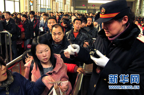 2月7日,旅客在郑州火车站进站上车。当日是农历正月初五,春节假期接近尾声,郑州火车站返程客流明显增多。铁道部发布的信息显示,节后客流压力将大大超过节前,第一个返程高峰将在2月8日出现。新华社记者 陈飞 摄
