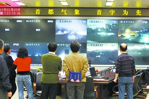 昨天21时30分 北京市气象局办公楼10层的天气会商室里,灯火通明。大屏幕上,全市天气云图实时呈现;电脑前,气象专家和值班预报员目不转睛地研究着多普勒雷达探测信息;气象局领导坐镇指挥,不时与前方观测点进行通话。