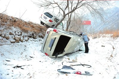 门头沟忠良书院附近,两辆车一挂树一翻沟。本报记者王苡萱摄