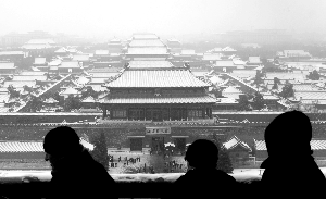 昨日,景山,游客们在山顶瞭望被大雪覆盖的故宫(微博)。本报记者 薛珺 摄