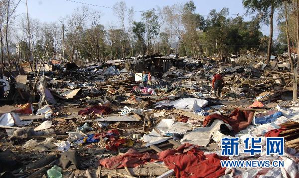 男孩儿蔡全东在自家被拆掉的房子前,这天他和父亲来收拾自家一些有用的东西(2月9日摄)。 新华社记者 侯建森 摄