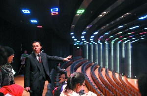 昨日,国家博物馆新馆内,一名工作人员在介绍国博影院。