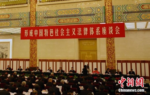 资料图:1月24日,全国人大常委会委员长吴邦国在北京宣布,中国特色社会主义法律体系已经形成,国家经济建设、政治建设、文化建设、社会建设以及生态文明建设的各个方面实现有法可依。中新社记者 任晨鸣 摄