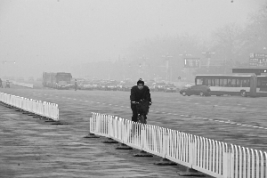 大雾中,一市民骑自行车经过长安街。昨日清晨,北京出现大雾。记者 周晓东 摄