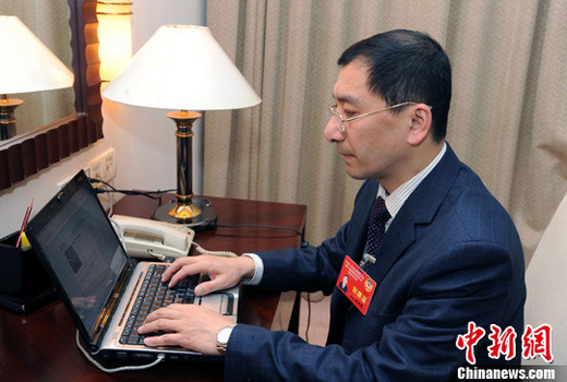 1月11日,福建省政协委员侯建明利用参会间隙在驻地宾馆房间,通过上网用微博与民众就普遍关心的热点民生等问题进行互动交流。当日,福建省政协十届四次会议在福州开幕。(图为资料图)中新社记者 刘可耕 摄