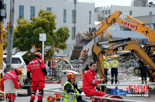 2011年2月26日,新西兰克莱斯特彻奇,中国救援队在CTV大楼展开救援工作。除废墟清理工作外,中国救援队还将利用生命探测设备搜寻幸存者。