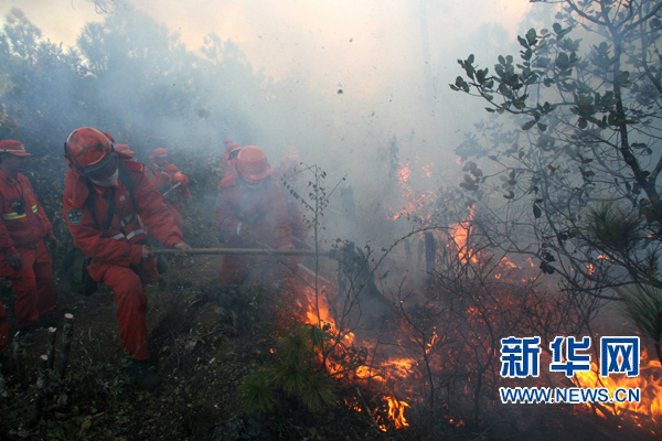 2月28日,在云南省丽江市玉龙县黄山镇五台办事处所属集体山林,丽江森警支队官兵正在灭火。