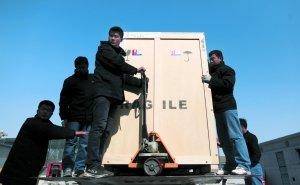 昨日,工作人员将文物从卡车上搬出。当日,新国博首次展览的珍贵文物运抵国家博物馆。记者 浦峰 摄