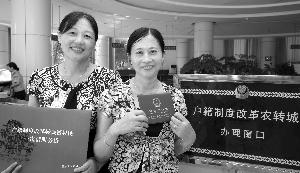 2010年8月4日,重庆永川区户籍制度改革转城镇居民首发仪式上,周伦菊姐妹领到城镇居民户口。资料图片