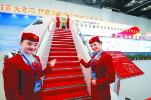 昨天,首架国产大飞机——C919大型客机样机也现身成就展,4位美丽的空姐分别站在大飞机铺着红毯的舷梯上下,礼貌地迎接着每一位参观者。
