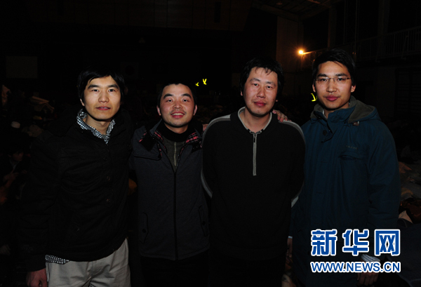 这是在仙台市立三条中学校安置点拍摄的日本东北大学中国留学生常海欣、昂然、王麟和金顶峰(左至右)(3月12日摄)。新华社记者 季春鹏 摄