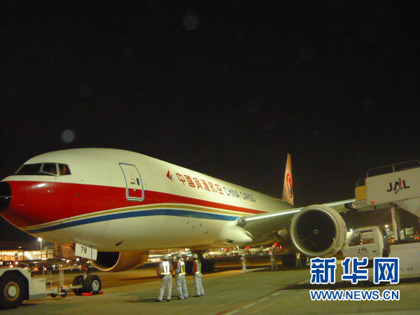 14日晚,中国政府第一架运送救灾物资的东航B777货机降落在羽田机场。飞机上承载了包括帐篷、毛巾被、手提式应急灯等共计100吨援助物资。(东航张明摄)
