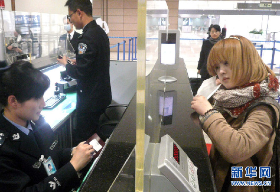3月16日,从日本抵达上海的旅客在接受边检。当日,上海机场口岸迎来日本航班入境高峰。据上海机场边检民警介绍,从16日10时47分起至12时,共有12架从日本起飞的航班集中抵达浦东国际机场,入境旅客数达2500余人。新华社发(刘友平摄)