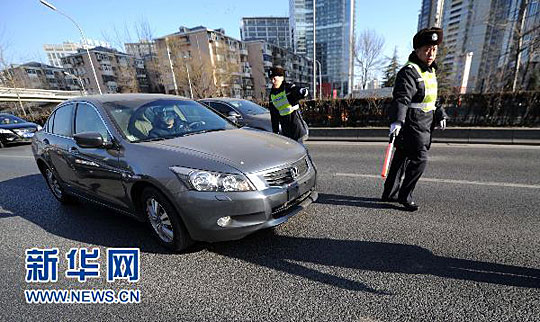 2月24日,交警在北京三元桥附近拦截一部没有上牌的车。当天,北京交管部门开展对涉牌违法车、霸王车的专项整治。此次专项整治是北京市“文明交通行动”的重要内容之一。李文 摄