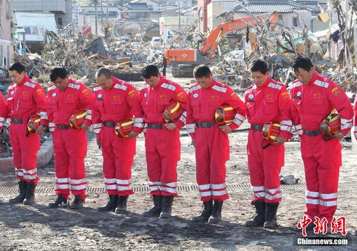 3月18日下午,日本民众为一周前大地震中6000多名遇难者举行默哀仪式,所有避难所和救援人员都停止作业,为死难者哀悼。图为在岩手县大船渡灾区,中国国际救援队向日本地震遇难者默哀。