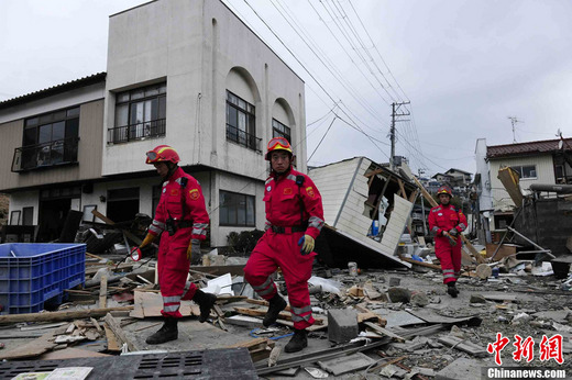 3月15日下午,几天前抵达日本岩手县大船渡市的中国国际救援队队员在进行搜救。大船渡市紧邻海港,是此次日本大地震中受灾最严重的地区之一。中新社发 侯宇 摄