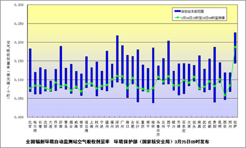 环境保护部、国家核安全局有关负责人今日介绍说,监测结果汇总图中绿色曲线代表监测值,蓝色柱体代表天然本底水平,绿色曲线均在蓝色柱体范围内。监测结果表明中国环境辐射水平未受到日本核电事故的影响。