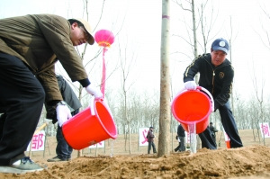 昨天9时,部长们陆陆续续来到滨河公园,他们一下车,便直奔植树地点,挥锹铲土,扶苗浇水,短短半天时间,就栽下了2800多株油松、银杏、白蜡、千头椿等树木。