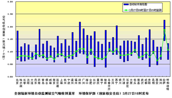 上图是环境保护部(国家核安全局)3月27日18时继续发布的全国省会城市和部分地级市辐射环境自动监测站实时连续空气吸收剂量率监测值。监测结果汇总图中绿色曲线代表监测值,蓝色柱体代表天然本底水平,绿色曲线均在蓝色柱体范围内。监测结果表明,目前我国环境辐射水平仍在本底范围内,日本核电事故未对我国环境及境内公众健康产生影响。
