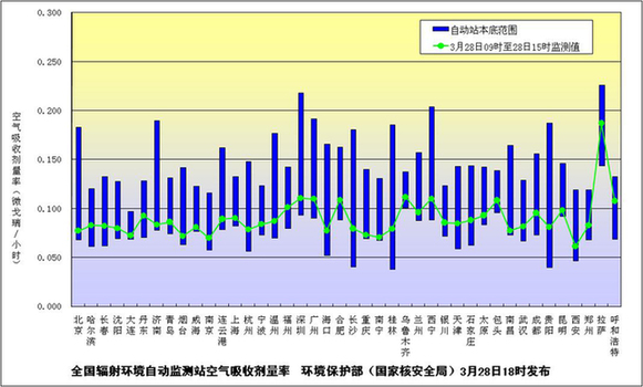 图是环境保护部(国家核安全局)3月28日18时继续发布的全国省会城市和部分地级市辐射环境自动监测站实时连续空气吸收剂量率监测值。监测结果汇总图中绿色曲线代表监测值,蓝色柱体代表天然本底水平,绿色曲线均在蓝色柱体范围内。监测结果表明,目前我国环境辐射水平仍在本底范围内,日本核电事故未对我国环境及境内公众健康产生影响。