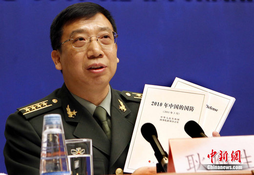 中华人民共和国国防部新闻事务局局长、国防部新闻发言人耿雁生大校,3月31日在国务院新闻办公室介绍中国发表《2010年中国的国防》白皮书的相关情况与解放军四总部相关军官回答中外记者提问。中新社发 宋吉河 摄