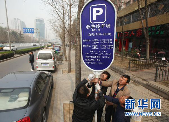 3月31日,北京公联顺达停车管理公司的工作人员在街头更换新的收费标准牌。王丹 摄