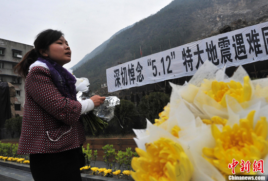 清明节将近,又度使三年前被大地震毁城的四川省北川羌族自治县县城废墟悲情笼罩,一位少女怀抱特别培植的春菊,前来公墓凭吊。中新社发 贾国荣 摄