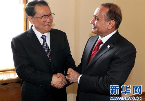 当地时间4月12日,中共中央政治局常委李长春在埃里温会见亚美尼亚议长奥维克·阿布拉米扬。 新华社记者 马占成 摄