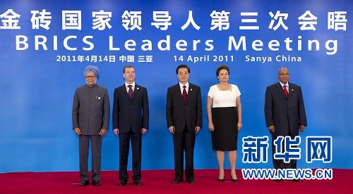 金砖国家领导人第三次会晤14日在海南省三亚市举行,中国国家主席胡锦涛、巴西总统罗塞夫、俄罗斯总统梅德韦杰夫、印度总理辛格、南非总统祖马出席。胡锦涛主持会晤并将发表重要讲话。