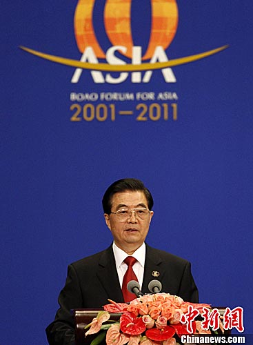 4月15日上午,中国国家主席胡锦涛出席博鳌亚洲论坛2011年年会并发表主旨演讲。中新社发 任晨鸣 摄