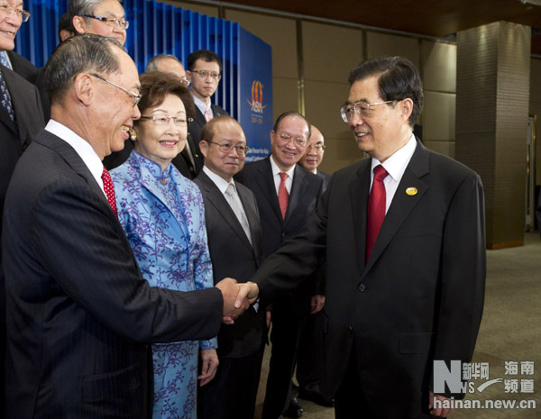 4月15日,中国国家主席胡锦涛在海南博鳌国际会议中心会见出席博鳌亚洲论坛2011年年会的台湾企业家代表并合影。