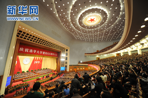 庆祝清华大学建校100周年大会在北京人民大会堂举行,党和国家领导人胡锦涛、吴邦国、温家宝、贾庆林、习近平、李克强等出席大会。