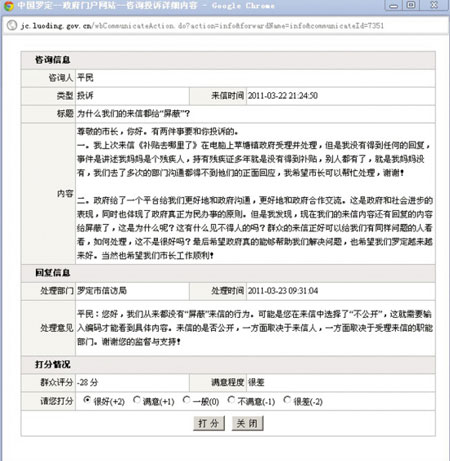 “罗定市行政电子监察大厅”运行4年来,收到群众来信近5000条,一度名声在外。刚开始运行时,市民反映的问题和答复,任何人都可以看到,现在却有不少答复说:“您所提交的信访件,已处理完毕,由于不便公开,我们将通过电话或邮件的方式回复您,或者您可以通过下方的业务编码查询查看处理结果。”