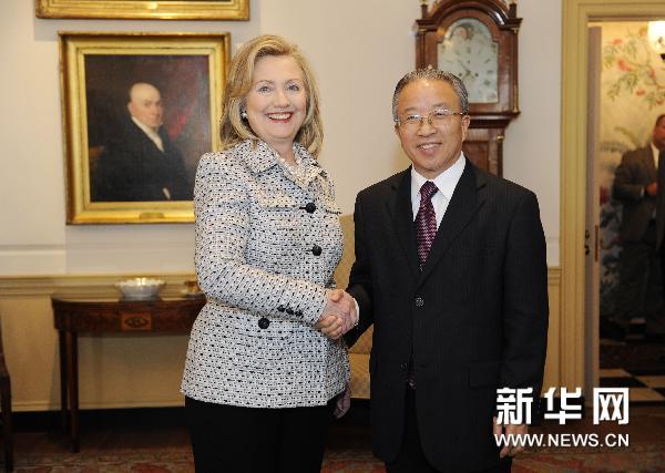 5月9日,在美国首都华盛顿国务院,中国国务委员戴秉国(右)与美国国务卿希拉里·克林顿举行第三轮中美战略与经济对话框架下战略对话第一场小范围会谈。新华社记者 张军 摄