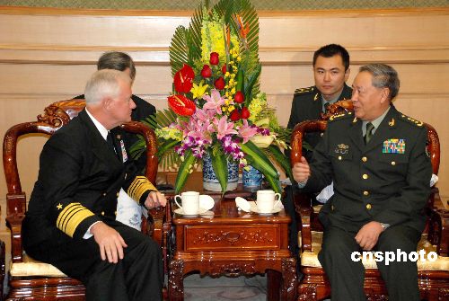 资料图片:2008年1月14日,中国人民解放军总参谋长陈炳德上将在八一大楼会见来访的时任美军太平洋总部司令蒂莫西·基廷海军上将一行。 中新社发 杨铁虎 摄