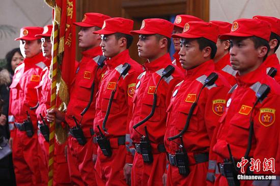 资料图:2011年3月13日,应日本政府请求,中国政府派遣中国国际救援队一行15人,乘坐中国国际航空公司包机前往日本,参加救援行动。中新社发 富田 摄