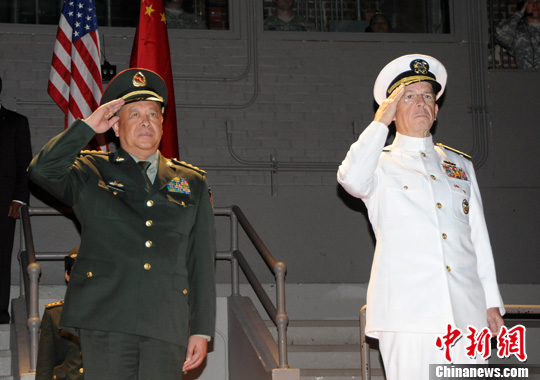 17日,美军参谋长联席会议主席马伦在华盛顿近郊的美军迈耶堡军营举行盛大仪式,欢迎中国人民解放军总参谋长陈炳德访美。中新社发 吴庆才 摄